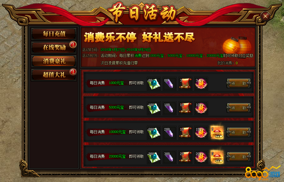 活动规则:活动期间,每日累积消费达到1000元宝、5000元宝、10000元宝、20000元宝时,可领取对应奖励(次日凌晨累积充值归零)
