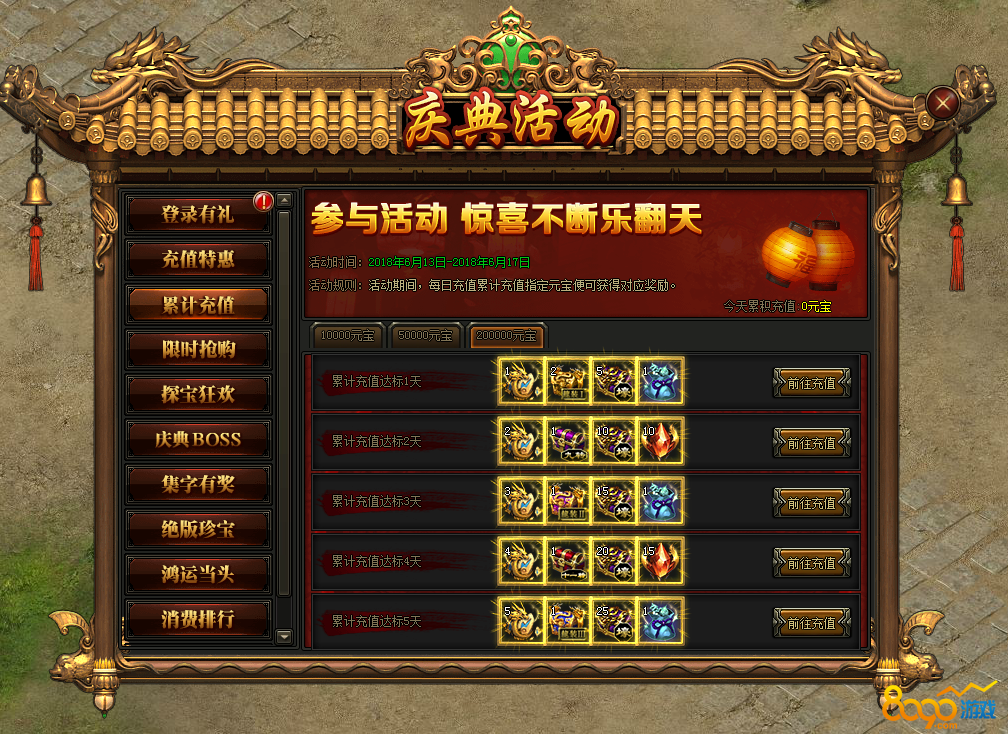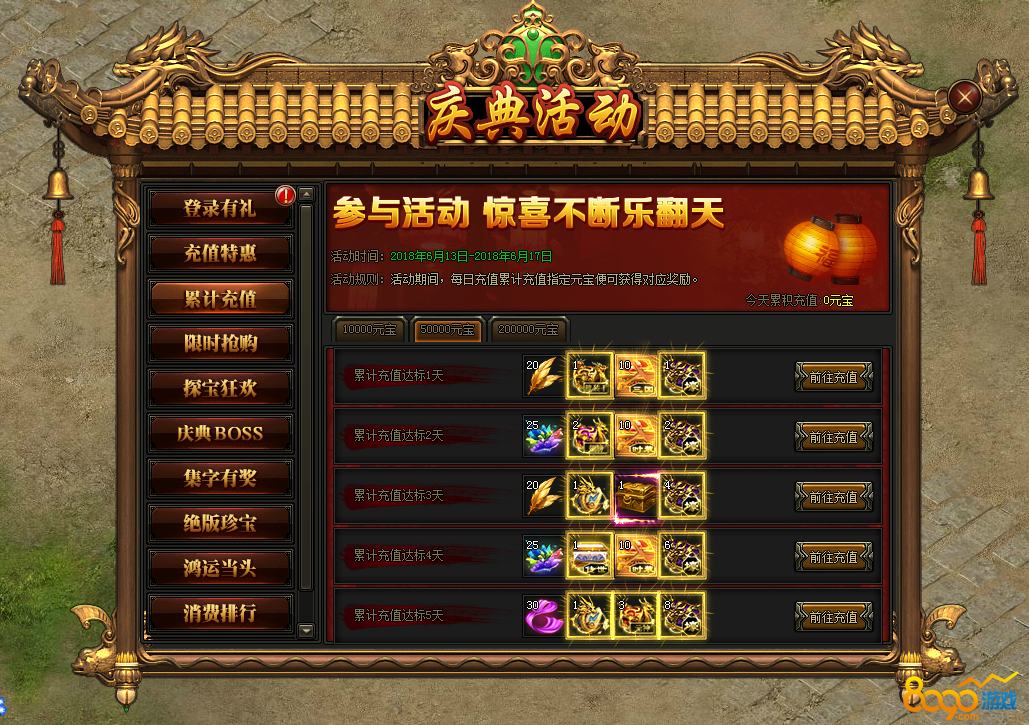 活动内容:活动期间,每日充值累计充值指定元宝便可获得对应奖励。