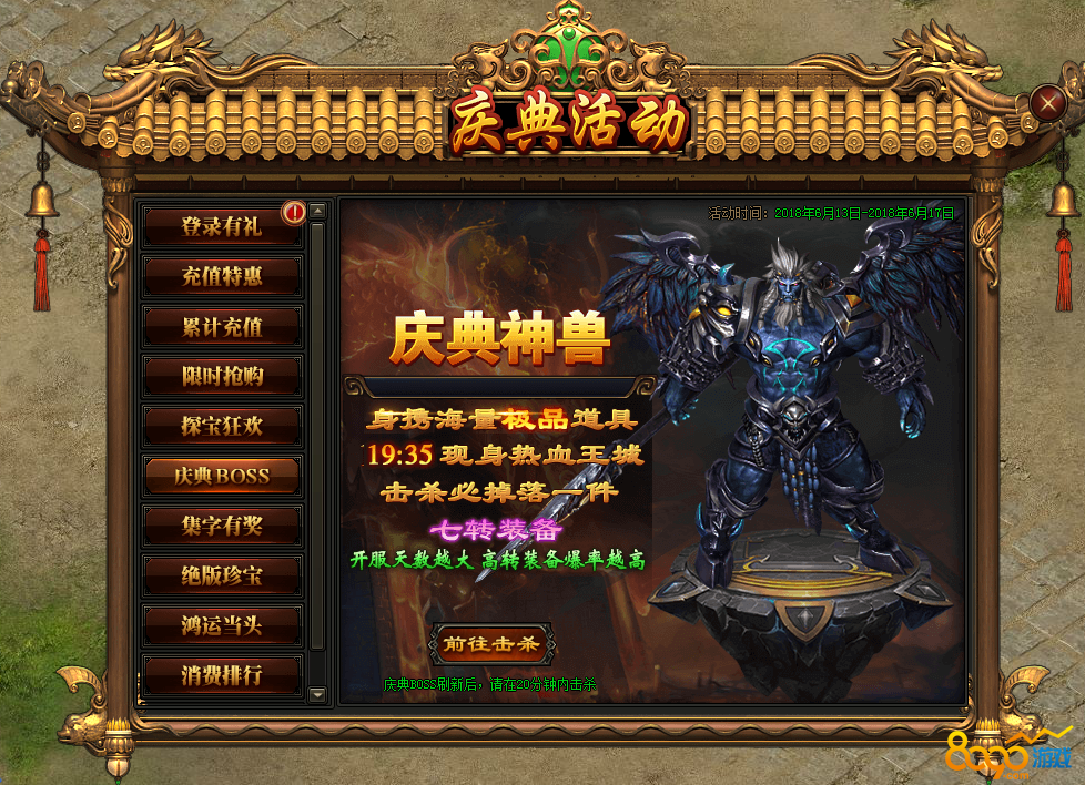 活动内容:活动期间,每晚19:35分热血王城(92,92)出现庆典BOSS,击杀必掉落一件七转装备(开服天数越大 高转装备爆率越高)。掉落物品可自由拾取。BOSS需在20分钟内击杀。