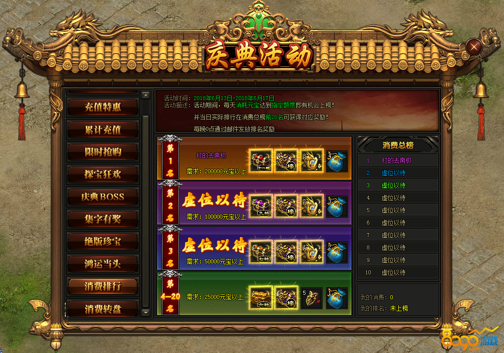 活动内容:活动期间,每天消费元宝达到指定额度即可上榜获得排名奖励!每天0点邮件发送奖励!