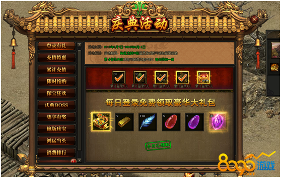 活动规则:活动期间,玩家登陆游戏即可领取豪华大礼包,累计登录天数决定可获得奖励内容!每天限领一份!