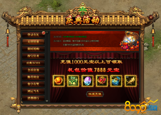 活动规则:活动期间,每天充值1000元以上即可领取价值7888元宝的豪华礼包!
