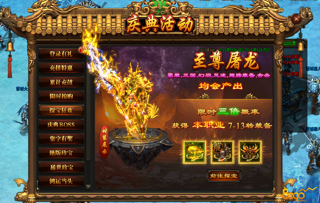 活动规则:活动期间寻宝将产出龍装、三国、幻羽、翅膀装备、足迹、合击道具、至尊屠龙套装;7-13转装备提升三倍概率。探宝获得的7-13转装备必为本职业。机会难得,切勿错过!~