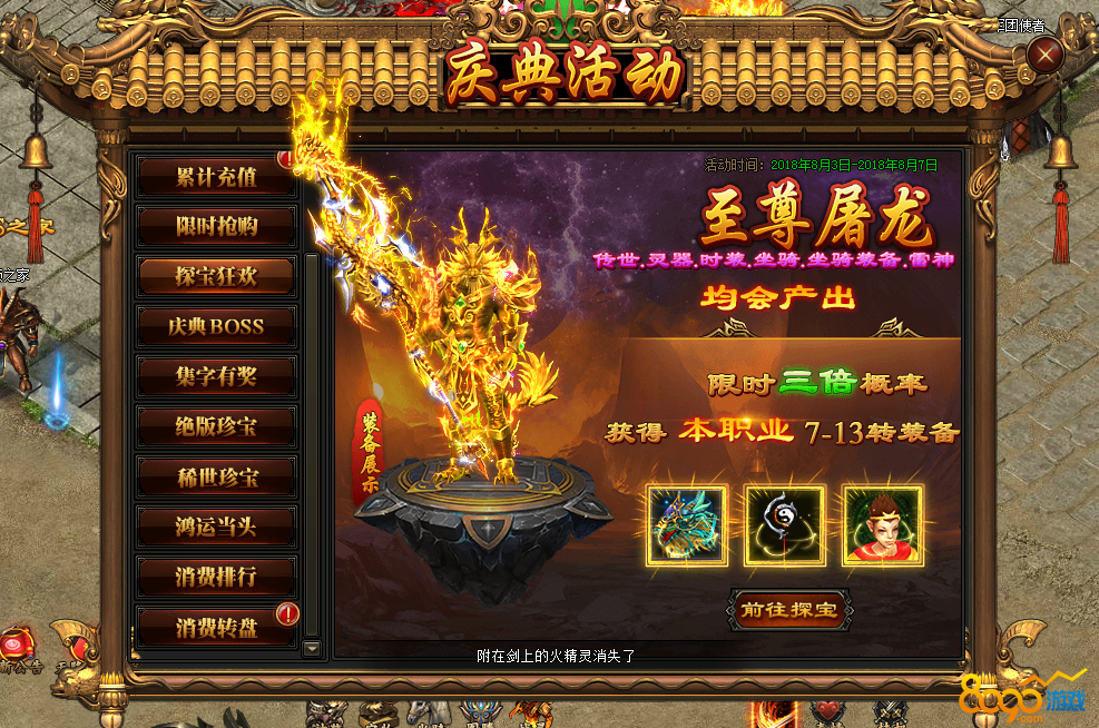 活动规则:活动期间寻宝将产出龍装、三国、幻羽、翅膀装备、足迹、合击道具、至尊屠龙套装;7-13转装备提升三倍概率。探宝获得的7-13转装备必为本职业。机会难得,切勿错过!~