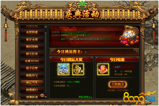 活动奖励:鸿运武器、鸿运战甲、鸿运当头称号、幻形水晶、至尊屠龙碎片