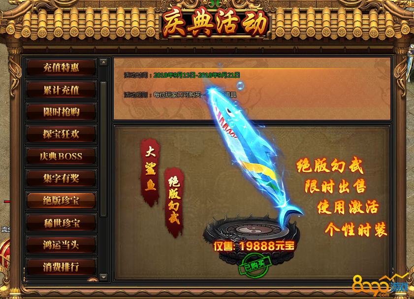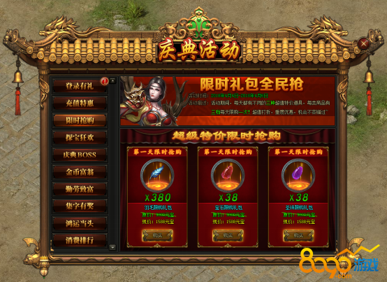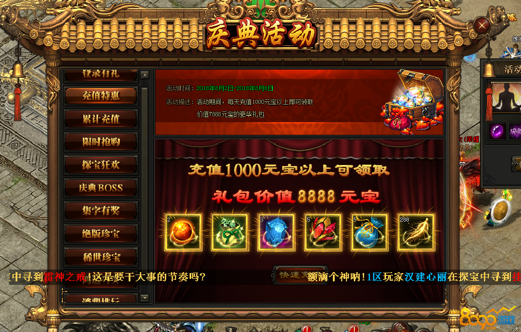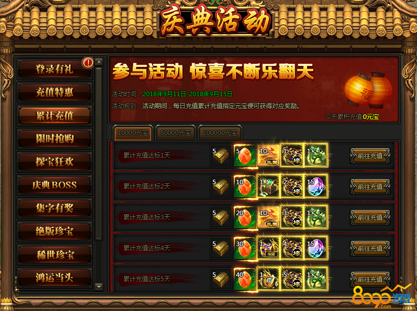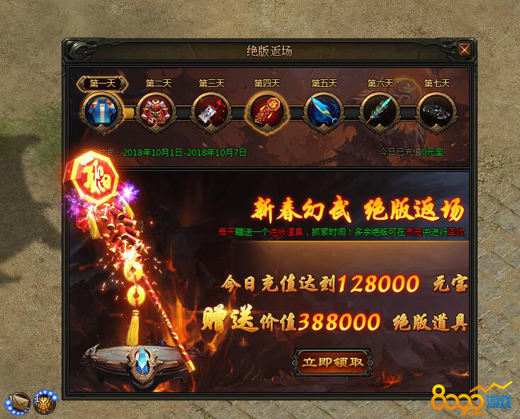活动规则:活动期间,每天充值1000元宝以上即可领取价值7888元宝的豪华礼包!