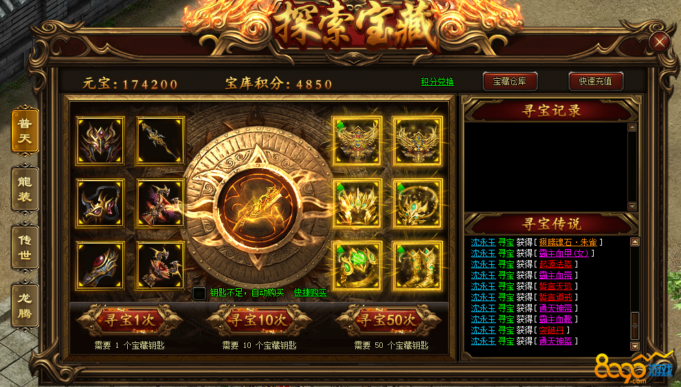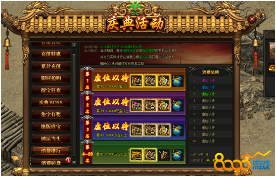 活动内容:活动期间,每天消费元宝达到指定额度即可上榜获得排名奖励,排名前三的玩家可以得到至尊屠龙碎片哦!每天0点邮件发送奖励!