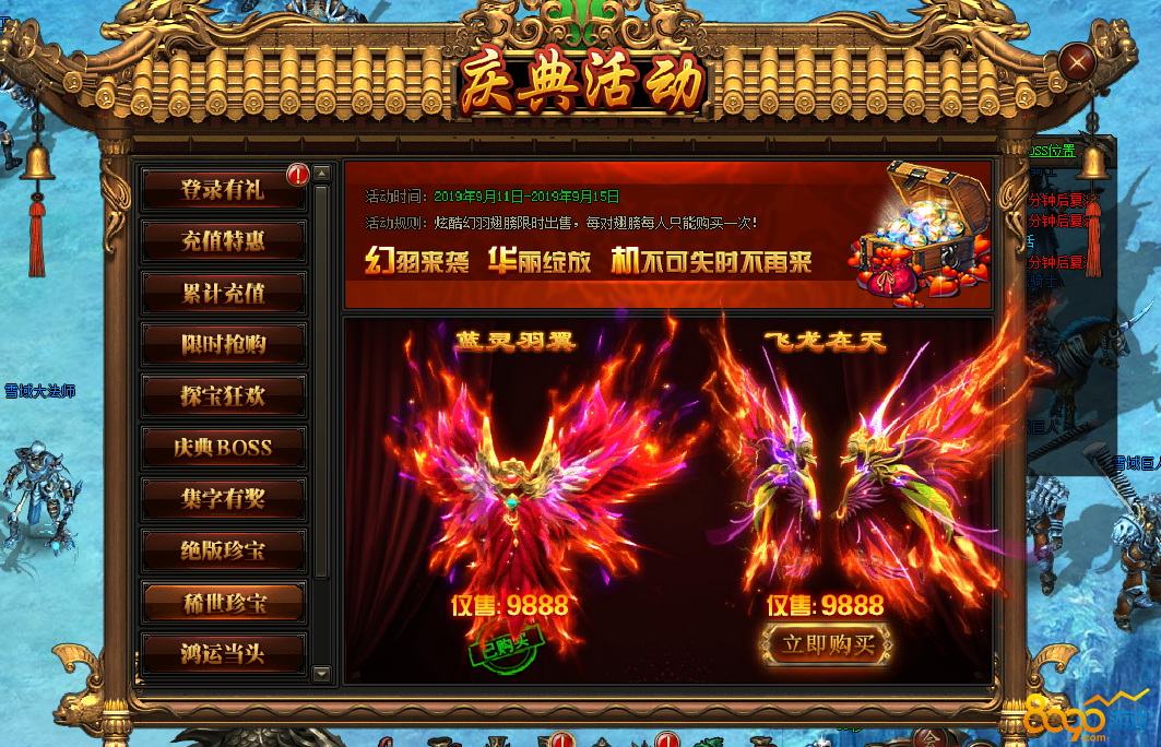 活动内容:活动期间,华丽炫酷翅膀限时出售,每对翅膀每人限购一次!