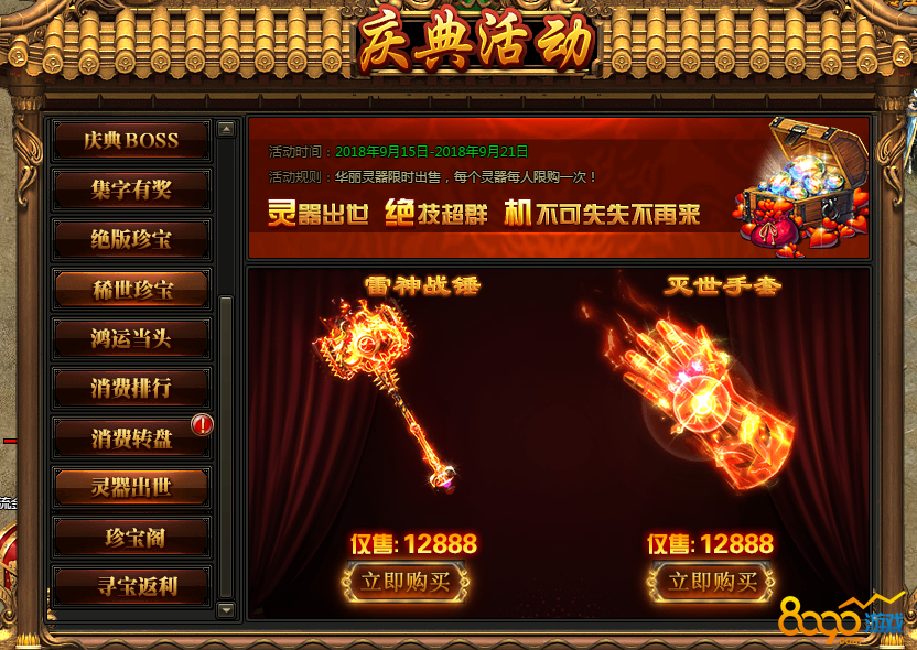 活动内容:活动期间,华丽炫酷灵器限时出售,每个灵器每人限购一次!