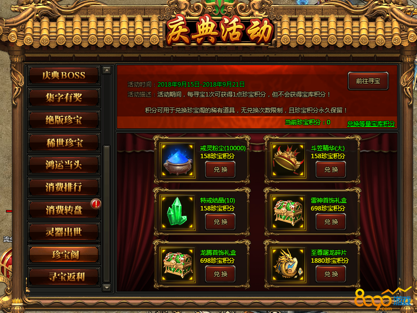 活动内容:活动期间,可用珍宝积分兑换珍宝阁稀有道具!