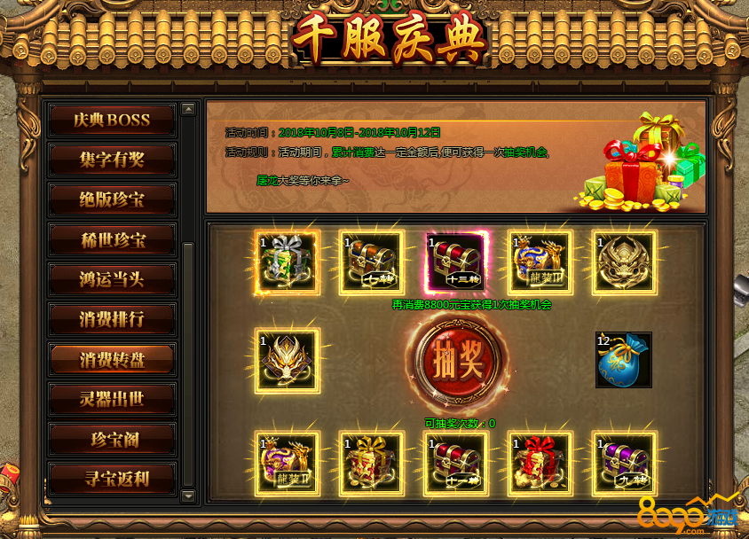 活动内容:活动期间,每天消费元宝达到指定额度即可上榜获得排名奖励,排名前三的玩家可以得到至尊屠龙碎片哦!每天0点邮件发送奖励!