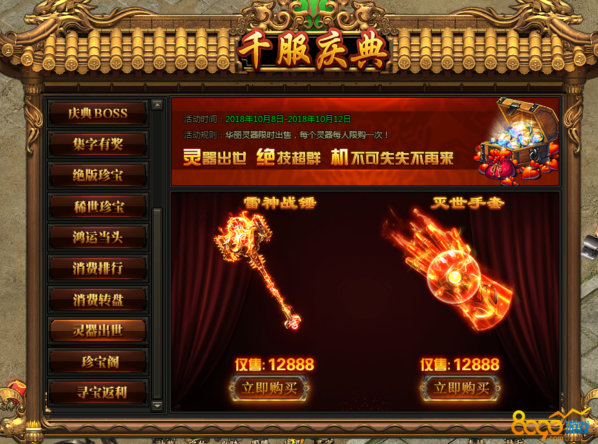 活动内容:活动期间,华丽炫酷灵器限时出售,每个灵器每人限购一次!