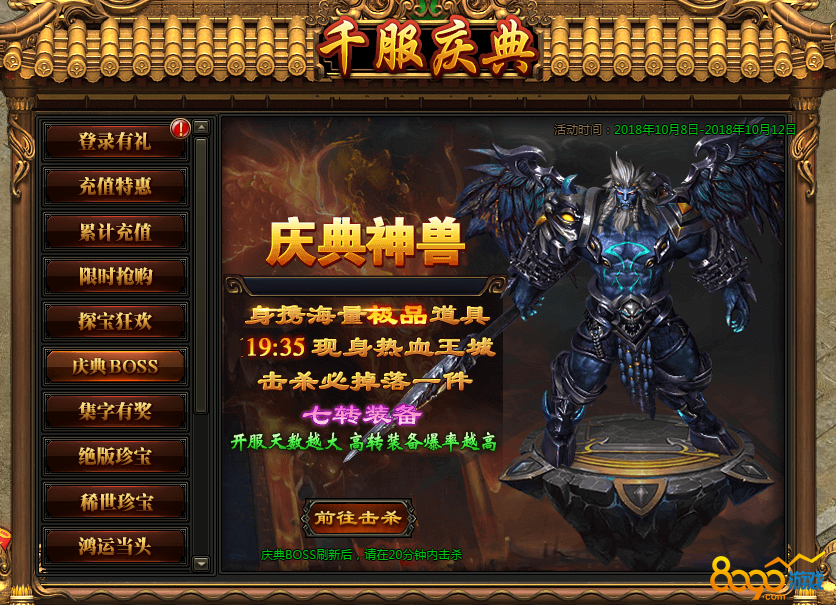 活动内容:活动期间,每晚19:35分热血王城(92,92)出现庆典BOSS,击杀必掉落一件七转装备。掉落物品可自由拾取。BOSS需在20分钟内击杀。开服天数越大,高转装备爆率越高。