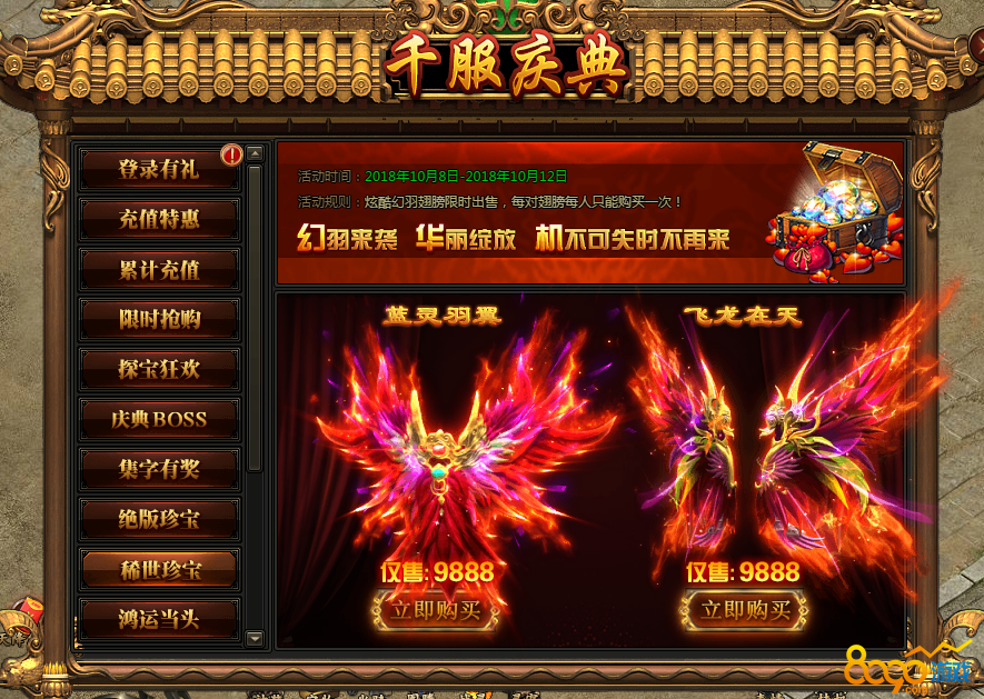 活动内容:活动期间,华丽炫酷翅膀限时出售,每对翅膀每人限购一次!