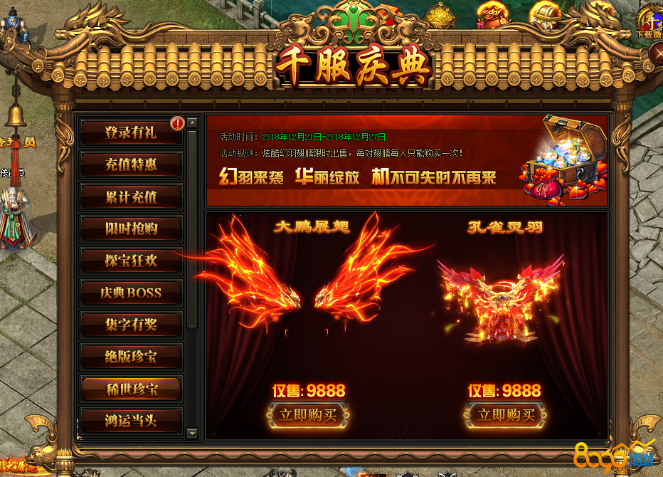 活动内容:活动期间,华丽炫酷翅膀限时出售,每对翅膀每人限购一次!
