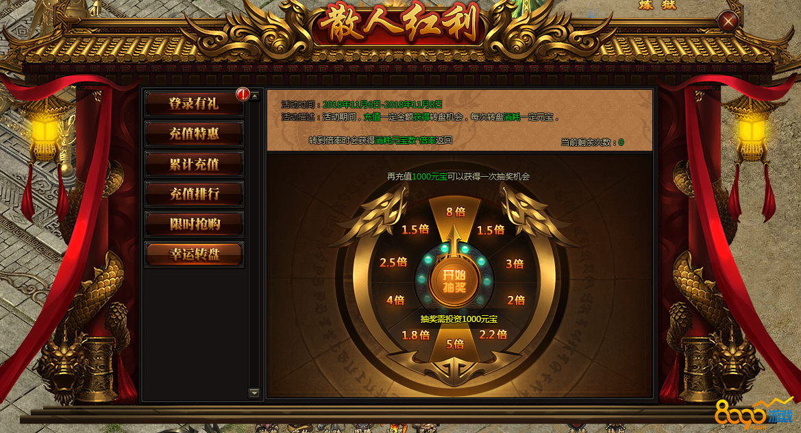 活动规则:活动期间,充值一定金额可获得转盘次数,转到倍率时可活动对应倍率的元宝奖励。