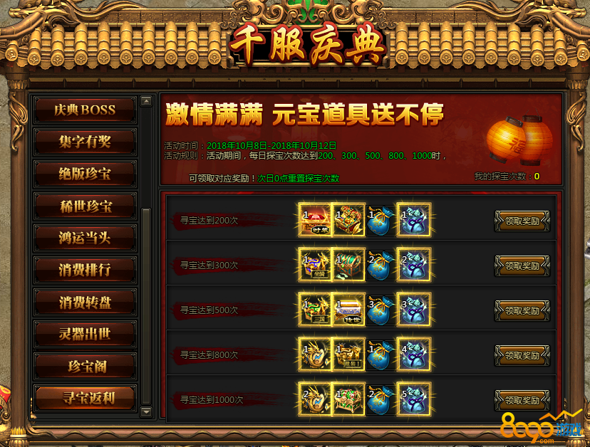 活动内容:活动期间,探宝达到相应次数可领取对应奖励!