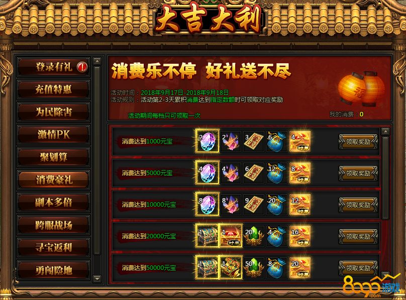 活动规则:活动2-3天累计消费达到指定数额时可领取对应奖励,活动期间每档只可领取一次