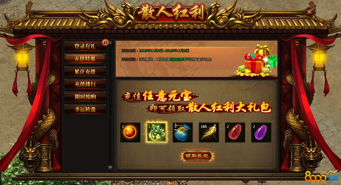 活动规则:活动期间,每充值任意金额即可领取豪华礼包。