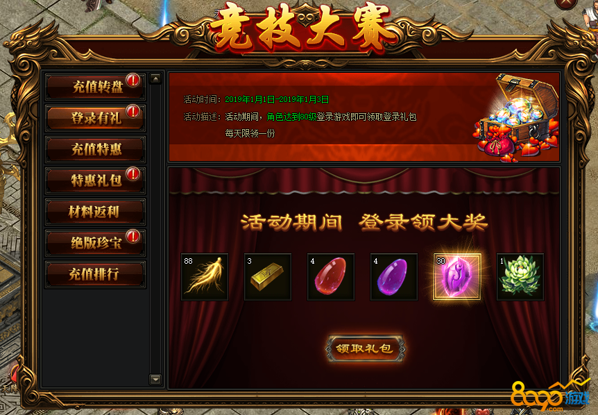 活动规则:活动期间,角色达到80级登录游戏即可领取登录奖励