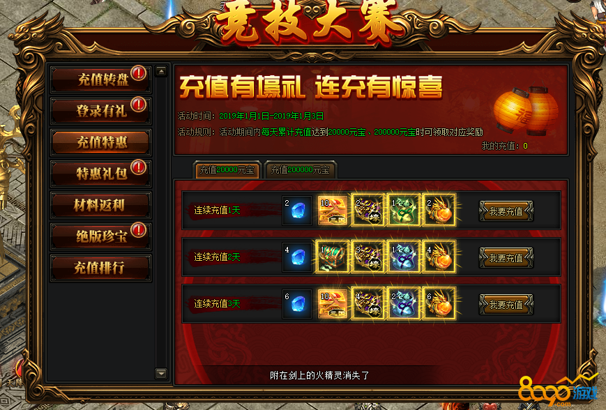 活动规则:活动期间,每天累计充值达到20000元宝、200000元宝即可领取对应奖励。