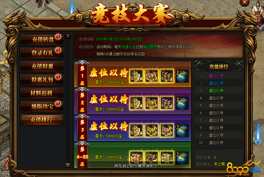 活动规则:活动期间,每天充值元宝达到指定额度即可上榜获得排名奖励。