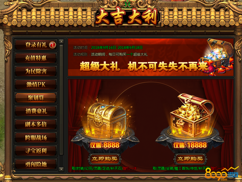 活动规则:活动期间,每日可购买一个超级大礼,机不可失失不再来