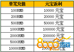 活动内容:活动期间,单笔充值达到对应要求即可获得100%的元宝返利,活动仅限3天!