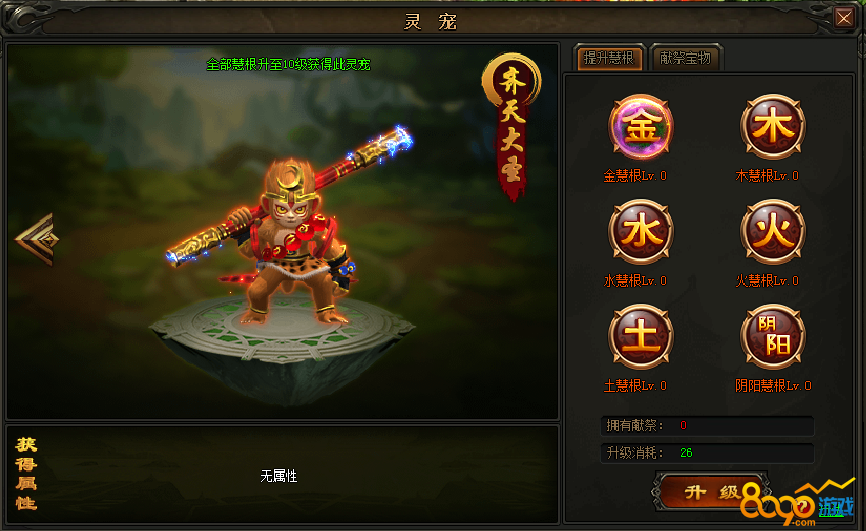 b.六大慧根等级均达到10级后便可获得灵猴灵宠,之后版本会更新加入六大慧根等级达到15/20/25级可获得的灵宠。
