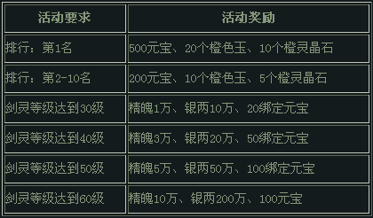 活动内容:活动期间,剑灵培养达到指定条件即可领取丰厚奖励,排行取排行榜剑灵排行信息(剑灵等级一样,则剑灵经验多的排前)。(排行榜整点刷新)
