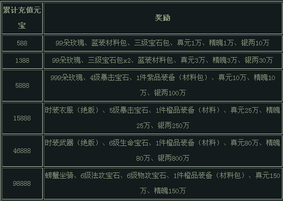 活动内容:活动期间,玩家累计充值达到不同的额度,每个额度都有充值大礼包倾情相送!礼包不仅包含各种珍贵实用的道具,大量银币、高品质装备材料、精魄应有尽有!