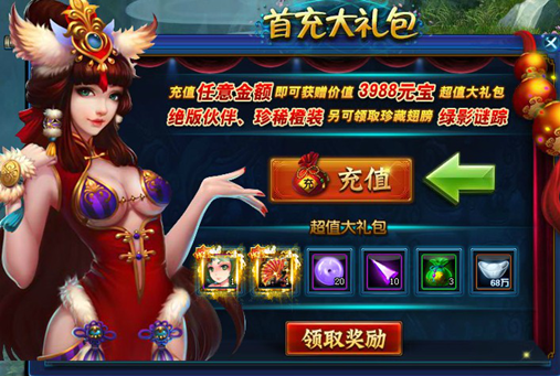活动内容:活动期间,充值任意金额即可获得价值3988元宝超值大礼包一份。新服开启,倾情奉送,仅需小小的投资,即可获得价值不菲的橙色荣誉坠饰和紫装材料,更有紫色“蝴蝶仙子”伙伴助你赢在起跑线上,心动不如赶快行动!