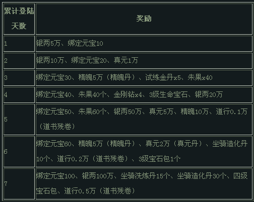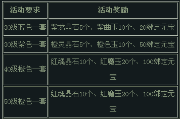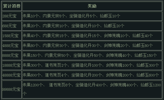 活动奖励:紫色材料包、超值宝石箱、朱果50个、坐骑造化丹30个、银两688888、真元60000