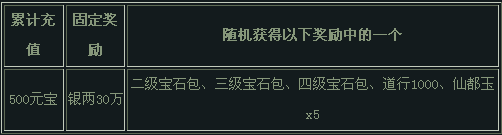 活动内容:活动期间,每充值累计充值满500元宝即可领取礼包一份,多充多拿,拿到手软!