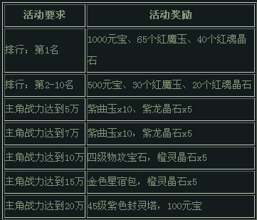 活动内容:活动期间,达到指定条件即可领取丰厚奖励,排行取排行榜战力排行信息(排行榜整点刷新)