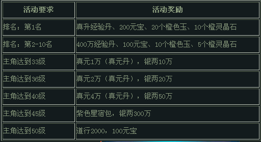 活动内容:活动期间,只要达到指定要求,即可获得丰厚大礼,排行取排行榜主角等级排行信息。(排行榜整点刷新)