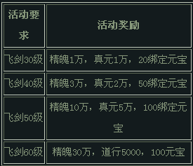 活动内容:活动期间,飞剑等级达到指定等级可领取奖励。可以通过消耗精魄提升飞剑等级,飞剑必须为装备状态。一种奖励只能领一次。