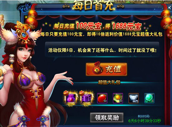 (2)首充后,第二天即可开启每日首充活动,持续6天!活动期间,每日首次充值达到100元宝可领取一份每日首充奖励。史无前例,16倍超值大返利!!!