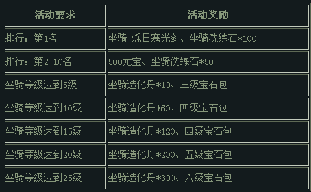 活动内容:活动期间,坐骑等级达到指定条件即可领取丰厚奖励,排行取排行榜坐骑排行信息(排行榜整点刷新),同阶坐骑按阶段的经验多少排名。