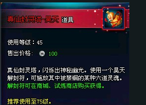 玩家可以通过昊天解封符来解封真仙封灵塔,昊天解封符可从商城、试炼商店购买获得。