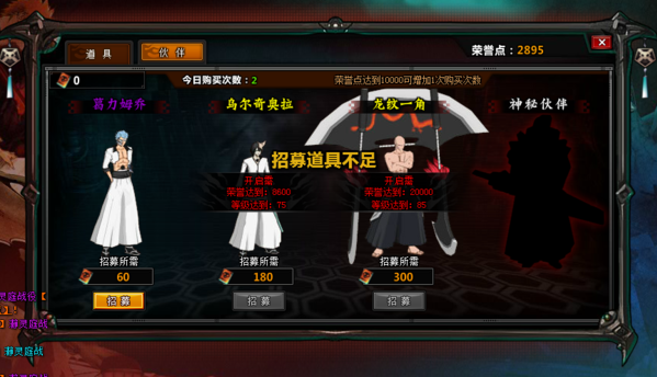 如果你想获得小葛,小乌,龙纹一角,那么就要积累多多的同盟契约了,但是光存够了同盟契约也是不行的,如果玩家们的等级和荣誉达不到需求,那也是不能招募的,所以想在8090死神狂潮中招募小葛,小乌,龙纹一角的话,等级荣誉同盟契约都要准备充足哦。