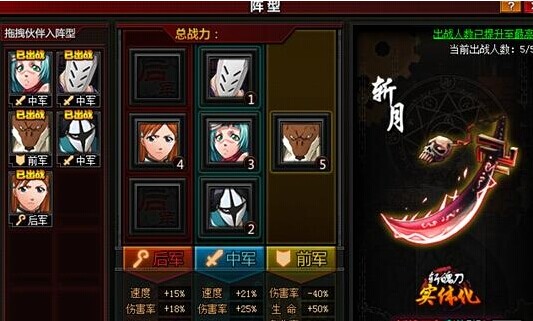 以上就是小编为大家带来的死神狂潮阵型的知识,+玩家可以魂技选择出阵的角色,不一定前、中、后都有相应的角色,前期为了加强输出,可以考虑一个前锋二个中坚的阵型。