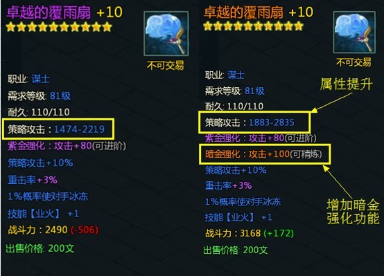 对80级以上的紫色品质装备使用暗金石,即可将紫装进阶为橙装;进阶后的橙装的基础属性会再次大幅提升;进阶橙装之后,装备开通暗金石精炼功能。
