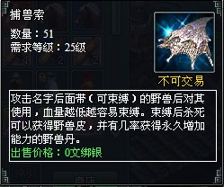 当玩家达到25级的时候,狩猎系统就对玩家开放了,玩家可以凭借商店里出售的“捕兽索”对野外的动物进行捕捉。