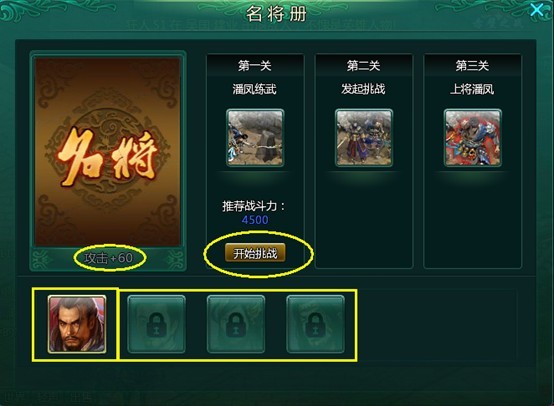 打开‘名将册’界面,选择某位英雄,点击就可以开始挑战;