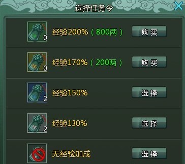 RMB玩家可以选择花费300两非绑银直接完成任务,非R玩家们就必须真枪实弹上场杀敌啦。既然是任务,肯定少不了任务令经验加成了,完成任务的同时收获大量经验。任务令可以在打怪以及神秘商店购买获得,分为令白(1.3倍)、令蓝(1.5倍)、令黄(1.7倍)、令绿(2倍)。