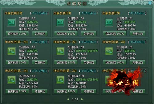 不是英雄不玩8090盛世三国,若玩8090盛世三国你就不会寂寞。曾经的种种悄然离去,有些早已不在,但有些你找找它依旧不离不弃的还在你身边!例如8090盛世三国的经验找回系统。它会准确的告诉玩家有哪些任务还没有完成,同时还把该任务的经验、加成等等都标明,这样更加方便玩家们寻找。经验找回系统设置了免费找回经验和银两找回100%这两个按键。玩家们可以自己选择,如果你选择免费找回,那找回的几率不会很大,但是如果你选择银两找回的话,那找回经验的几率就是100%。