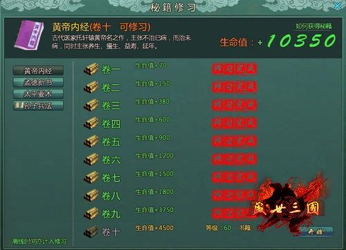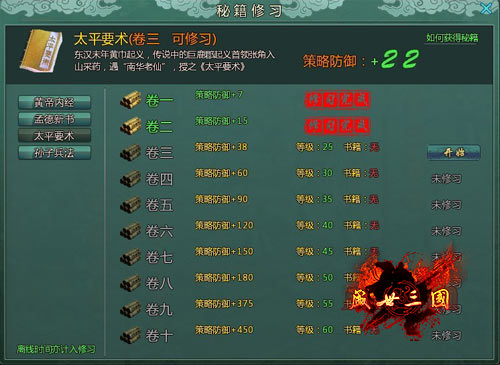 8090《盛世三国》的秘籍修习分为《黄帝内经》、《孟德新书》、《太平要术》和《孙子兵法》。每一个秘籍都有它的来历,大家可要刻苦修习哦!学得越多,变得越强。