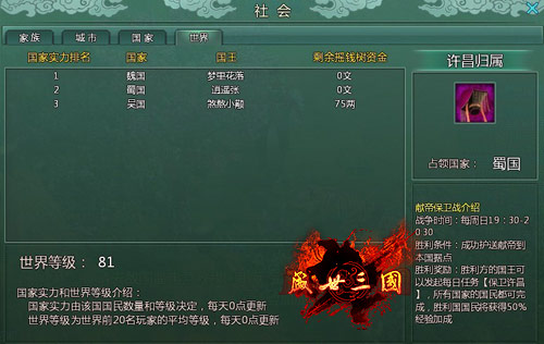 8090盛世三国游戏中再现了三国时代完整的国家体系、建设机制、税收机制、社会福利机制等社会玩法要素。在保持游戏趣味性与游戏性的同时,给予社会底层玩家足够的关注,整个系统强调弱势与强势群体的平衡,关注普通玩家的生存、生活、成就感,让整个8090《盛世三国》的游戏世界浑然一体,大家同处于一片蓝天下。