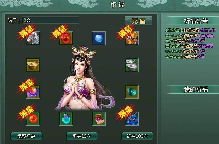 看着心动了吧。每位30级以上的玩家每天都可免费祈福1次,花费990两即可进行10次祈福,花费9锭800两的可以进行100次祈福哦。
